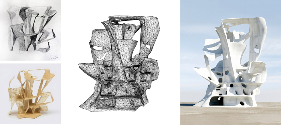 Three case studies contextualize these findings: (1) constructing speculative narratives around self-referential Hybrid Artefacts and (2) replicating the process using abstract drawings by Hermann Finsterlin and Friedrich Kiesler. (3) Implementing a double transformation process: abstract drawings are first converted into digital models, then materialized as 3D-printed physical objects.