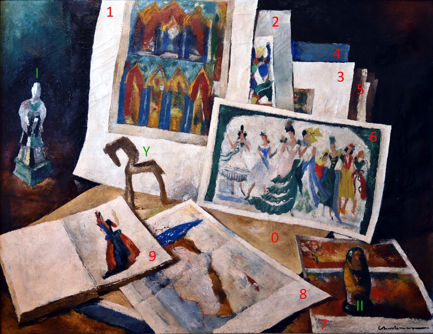 Flowers, women, instruments; reccurring themes; an open case, a violin, more paintings of flowers, stacked on top of even more flowers, a sailing boat and a tea-pot, an interesting mess of a bunch of objects lying around.